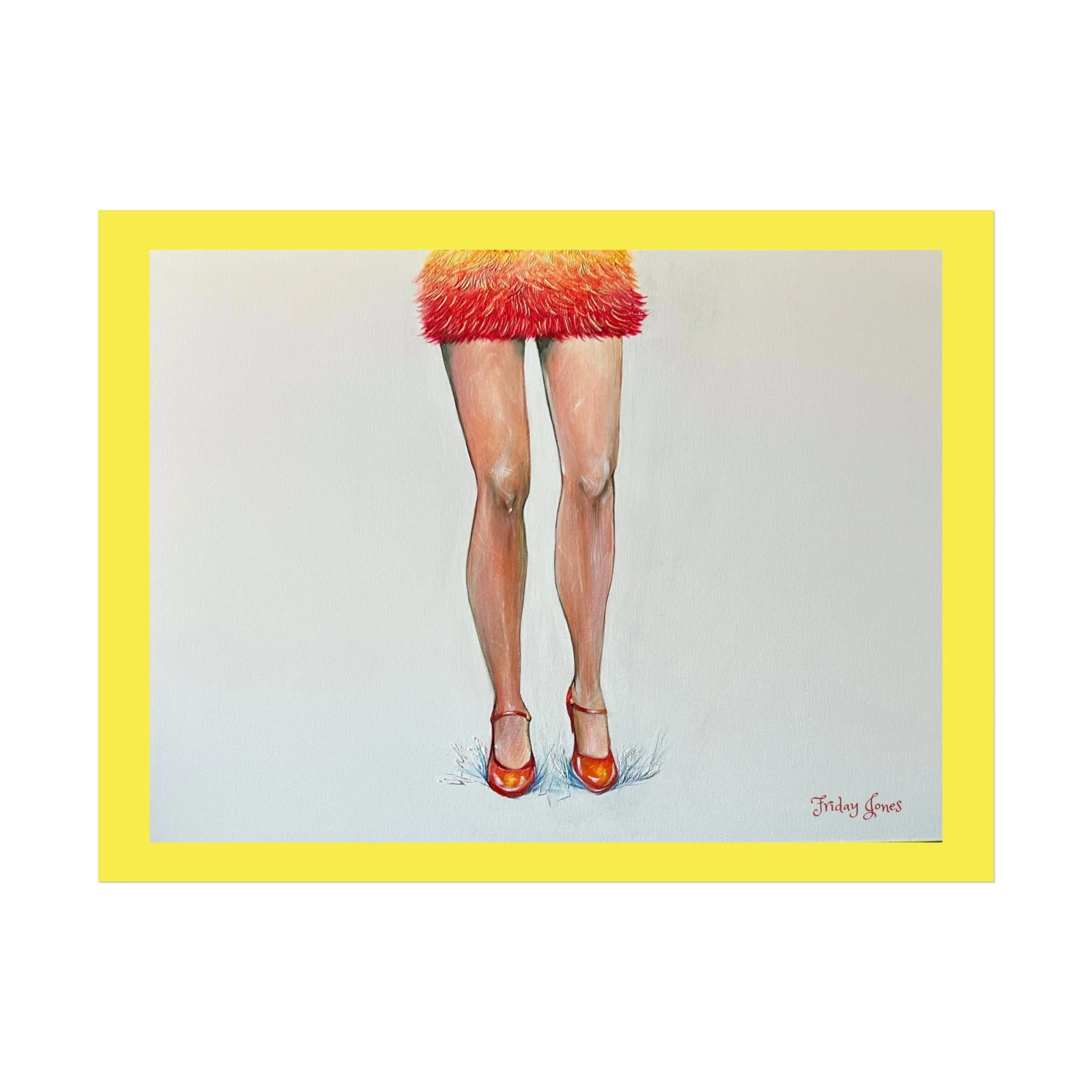 A vivid fine art poster that captures a playful, confident moment — just Charo's octogenerian legs in bright heels and a textured, feathery skirt framed by a bold yellow border. Printed with giclée quality on smooth, acid-free 220gsm paper, the image keeps its color depth and subtle skin tones while the matte finish reduces glare and feels gallery-ready. This piece brings a splash of personality to living rooms, dressing rooms, or studio walls and fits easily into curated displays or mixed-gallery arrangements. Choose horizontal, vertical, or square formats in multiple sizes to suit your space and composition preferences.