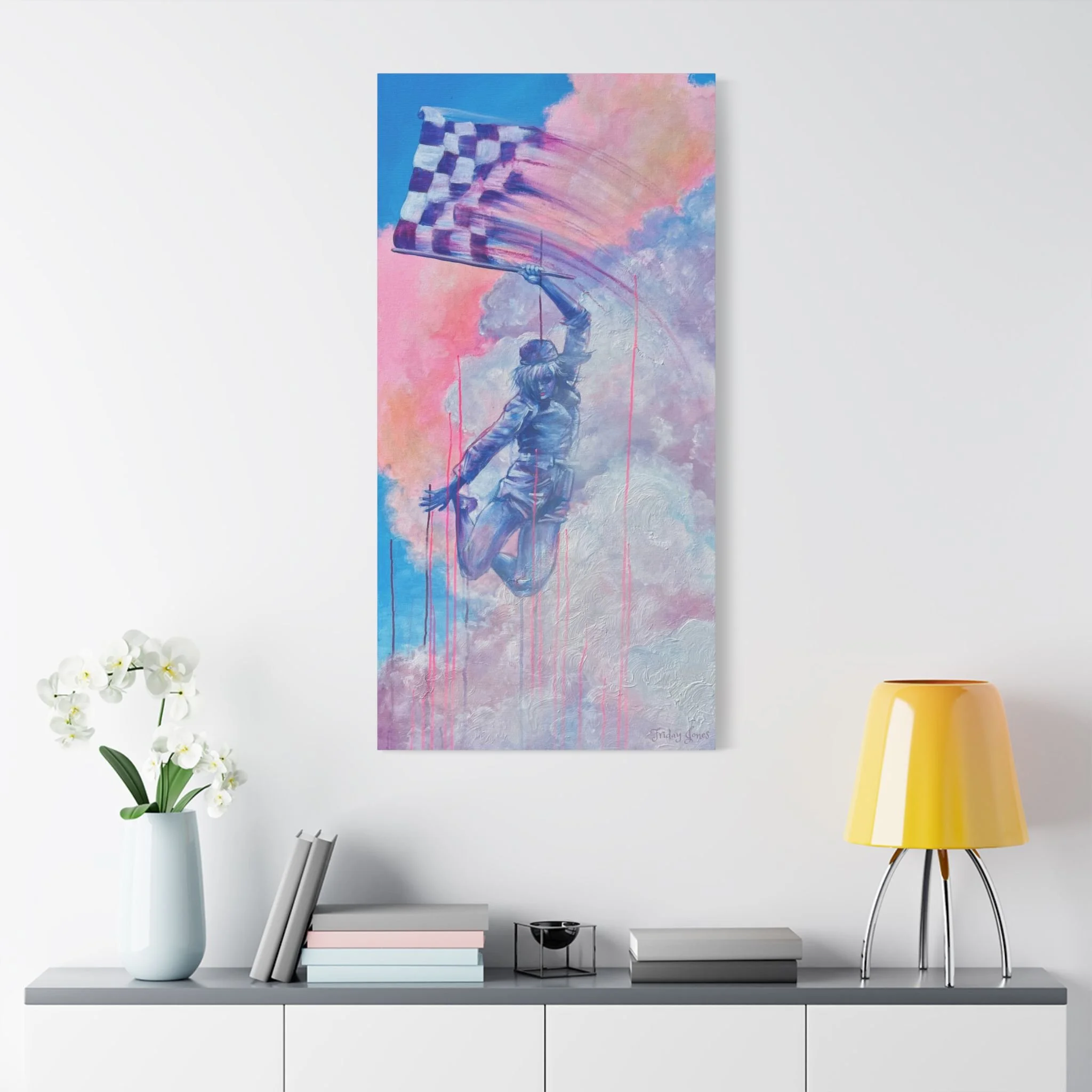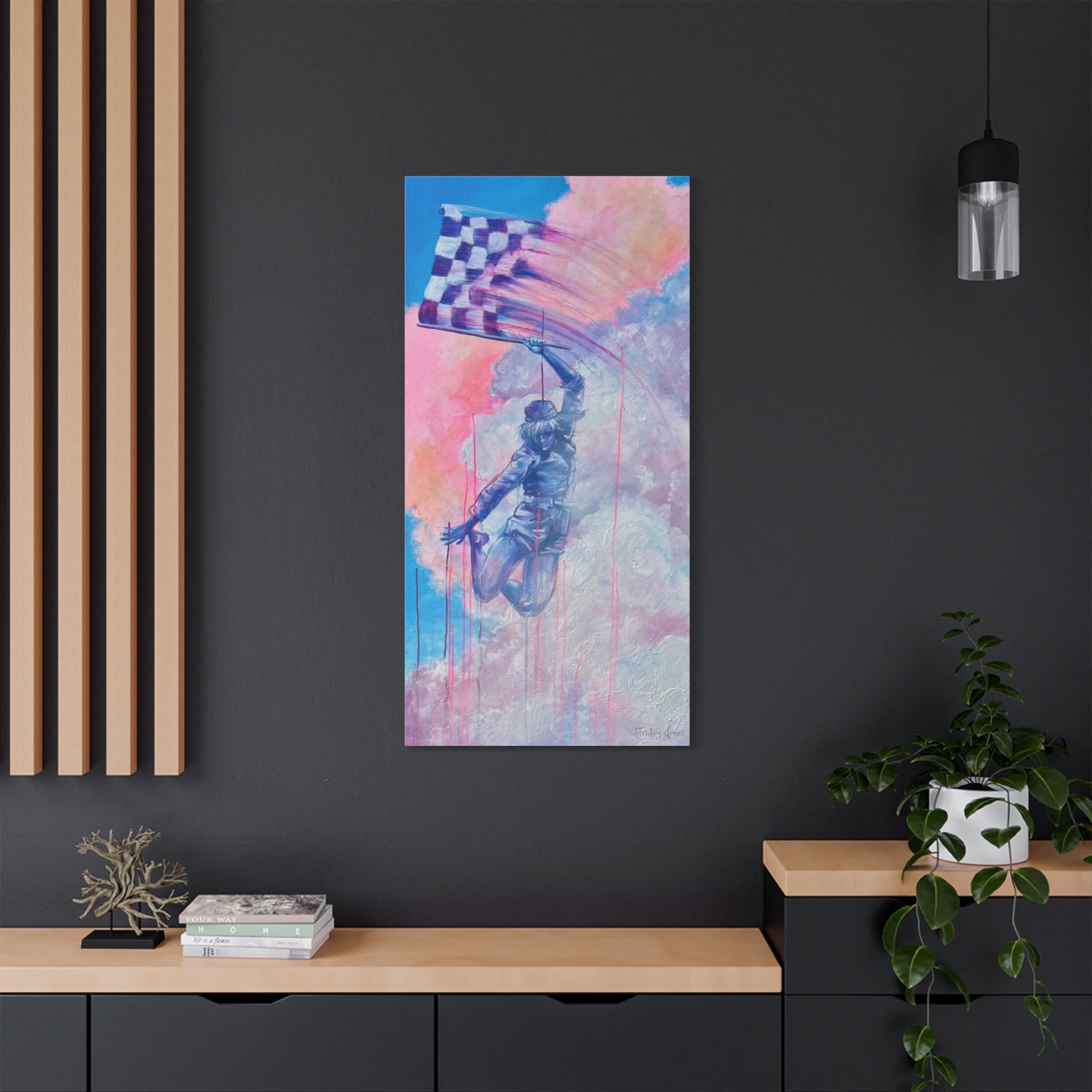A satin-finish stretched canvas that brings a dreamy, kinetic scene into your space. Soft pastels blend with vivid blues while a figure rises through cloudlike textures, waving a checkered flag that trails into painterly streaks. The satin polyester surface gives colors a luminous depth without glare, and the wooden inner frame keeps the composition taut and gallery-ready. Hang it vertically or horizontally to transform a hallway, studio, or reading nook into a moment of motion and calm — a piece that magnetically feels peacefully energetic.
