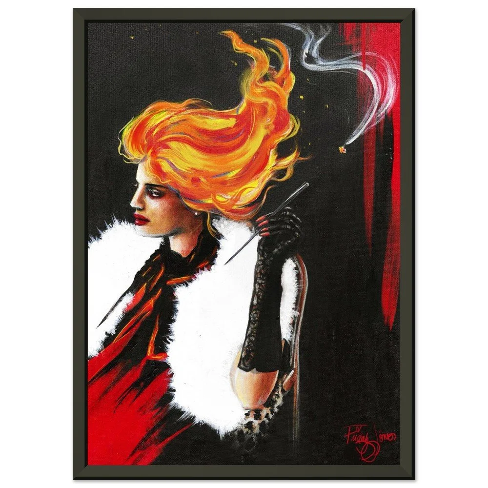 A simmering woman with hair of flame, seated in a finely-crafted leopard-skin chair and dressed in a red velvet gown and white fur. Her long red nails skewer through her full length, black-laced glove which holds an elegant, yet empty, cigarette filter. Magically, an ember suspended in space still burns. This piece captures a moment of fine mystery, inviting viewers to ponder what is missing from this woman’s life and what action she is preparing to get it.